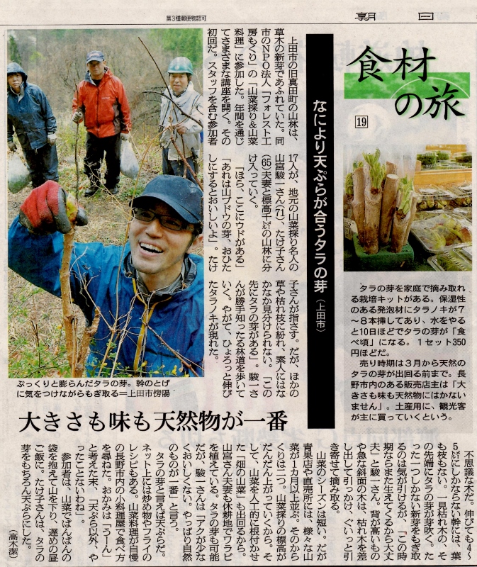 森林と暮らしの講座の山菜採りが取材を受け、朝日新聞の長野版に掲載されました。- 2013.05.15
