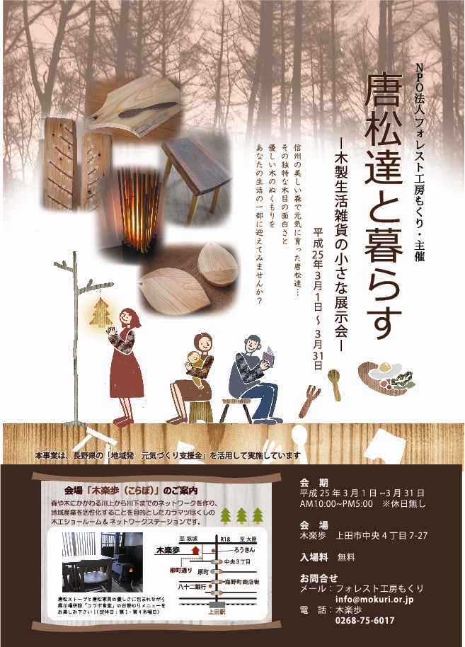 長野県東信地域に最も多く植えられている木、「カラマツ」を使った木工の展示会です。